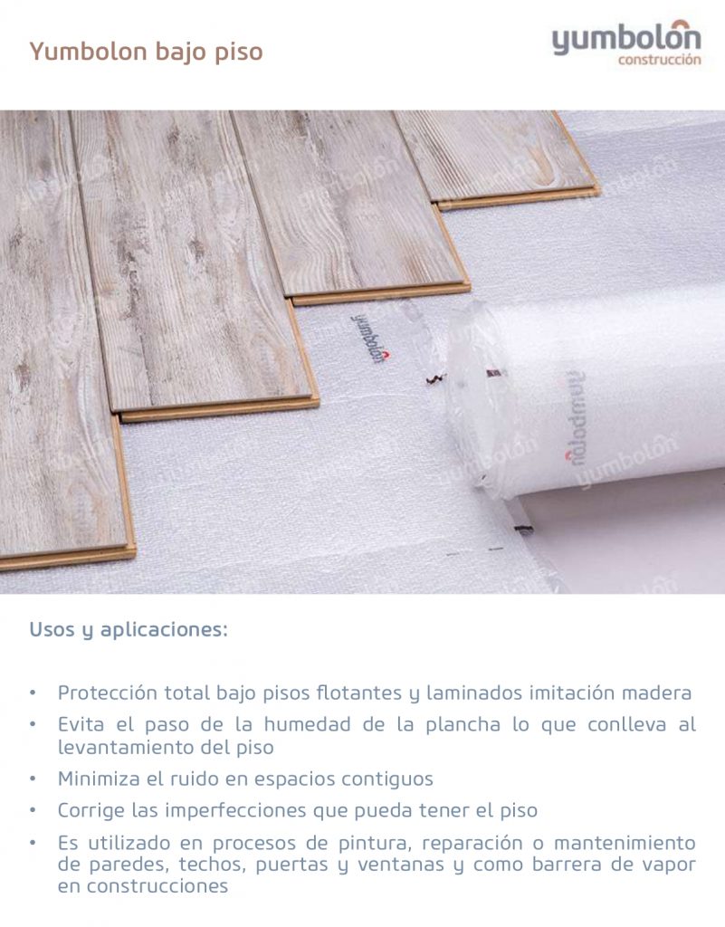 Bajo piso Protección total bajo pisos flotantes y laminados imitación madera, minimizando el ruido en espacios contiguos.